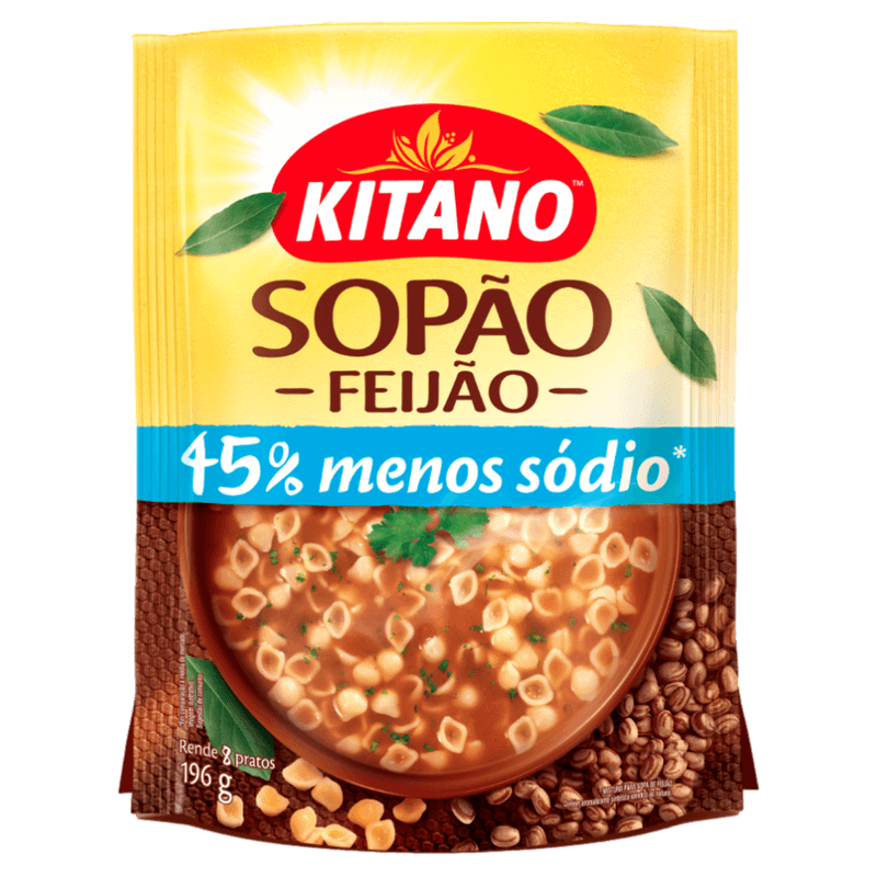O Sopão de Feijão com Macarrão e Bacon Kitano tem 50% menos sódio e tempero delicioso de ervas e especiarias.
